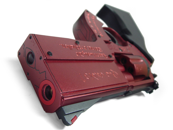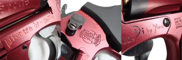 決して派手ではないが、深みのある色のフレームボディにはドイツ語らしき文章が「傷口に滴る血のような」赤く輝く文字で彫りこまれている。色はコーティングだと思われるが、長らく使い込まれたにしては剥げなどが見当たらないのは不思議な点である。 ○キャロムのSシルバーで下塗り後に(ダーク)メタリックレッドで塗装。刻印はゴシック体で手彫り後、メタリックレッド(本体とは別色)で色を入れました。