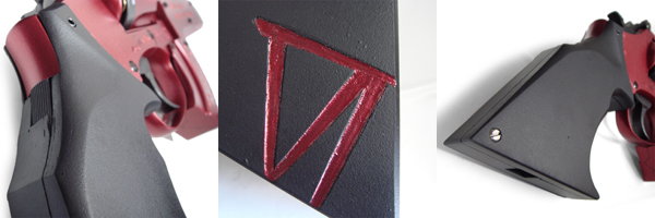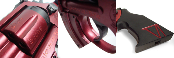 コンバットリボルバーのグリップにしては珍しい、シューティングタイプ・グリップ。左右非対称の一見特異な形状に見えるが、実際は握ると極めて安定したグリップ感覚で銃をしっかりとホールドできる。フラットな黒一面だが、左面下部にはローマ数字の「Ⅵ」が赤く大きな傷口のように刻まれている。