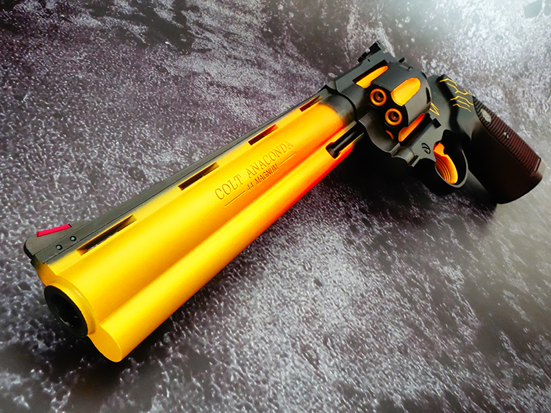 形状そのものはベース銃ほぼそのままなので至ってシンプルですが、黒地にオレンジ→黄色のグラデーションというかなり目を引くカラーリングなので強烈な個性は出せたかと(*´ω`)