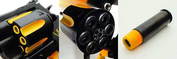 44口径の弾薬6発を装填するシリンダー。内部が高温で燃えており、通常の弾薬は装填できない。