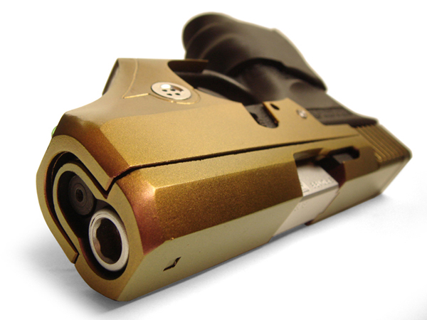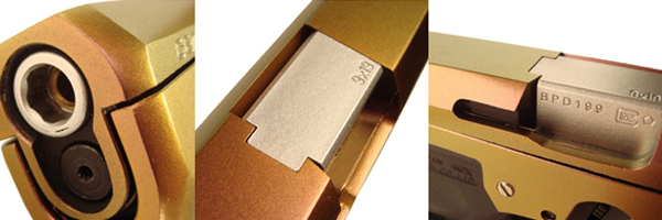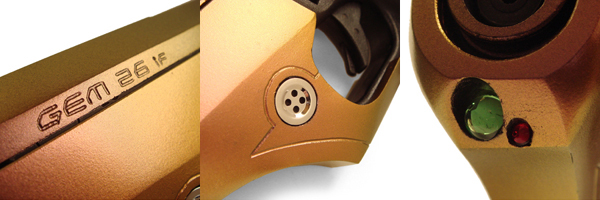 サイドにはシャープな文字で「GEM 26 if」の刻印。探知機器の効果を無効にする特殊コーティングで、色は角度によってゴールドからピンクに変わって見える。