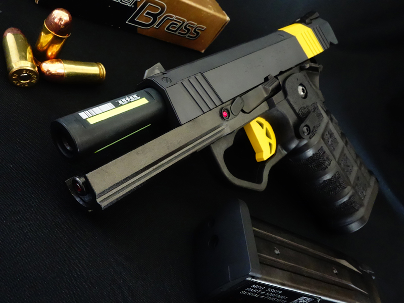 実銃モチーフはおそらくSTI(Science Technolgy Ingenuity)社製のガバメントモデル。世界スピード射撃選手権者のチップ・マコーミックと共同開発したコンバットシューティング・ガンで、スティール製レシーバーとポリマー製グリップを一体化させ、軽量化と高強度性を合わせ持つ多弾倉フレームを搭載した「現代的戦闘銃」です。
