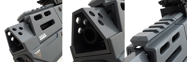 バレルそのものは9mm口径・フリーフローティングのショートバレル。その周囲を樹脂製のガードと変形六角型の特殊合金製バレルカバーが覆っている。