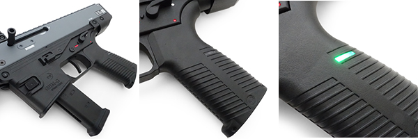 生体認証システムを搭載したグリップ。登録された正しい使用者がグリップを握れば銃のシステムロックが解除され、ランプが点灯する。