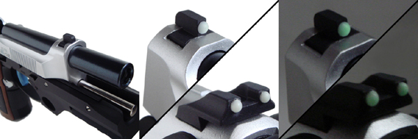 3ドットタイプで、ドットは視認性の高い立体型。薄暗い場所での行動を想定して、輝度の高い蓄光式。 ○純正サイトにプラの半球パーツを貼り付け、高輝度夜光塗料を塗り増した。照明を落とした室内などでは実際に役に立ちます。