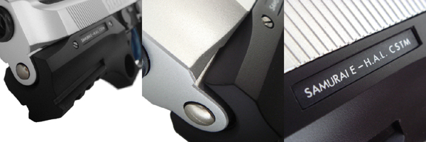 この部分がカスタムのメインであり、ある程度自由に出来る唯一のパーツだったので、思い切って曲線的&近未来的なデザインでオリジナリティを出してみました。側面の表示はホルスターとの摩擦で磨り減らないよう一段低くしています。