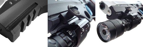レーザーサイトやライトなど、光学機器を銃本体へ装着できるようジル自身の希望で盛り込まれたレールパーツ。 ○この部分はライラクス製のマルチレイルミニ(金属製)を埋め込んで使用しました。