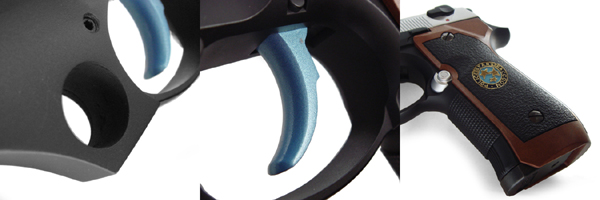 強度に優れたチタン製パーツ。アルマイト処理でジルのパーソナルカラーである「ライトブルー」に染められている。 ○カラーリングとしてもジルらしさを出そうと、トリガーも着色塗装しました。