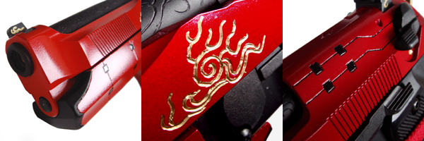 底部の「柄頭」には弾倉をスムーズに装填できるように挿入口を広げる工夫がされており、通常よりも迅速確実な弾倉交換が可能。さらにこの柄頭全体にわたっても燃え上がる炎の装飾が施されている。