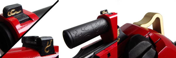 白の「三つ粒」仕様。フロント/リアの両側面には細やかな炎の装飾が施されている。 ○TM付属のホワイト・ドットサイトに模様を手彫りして、金ペンで色入れしています。
