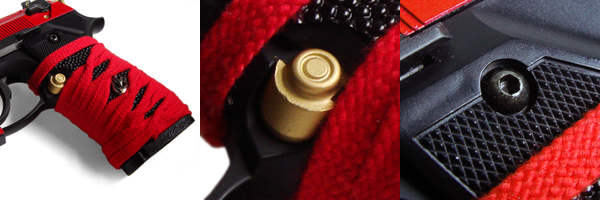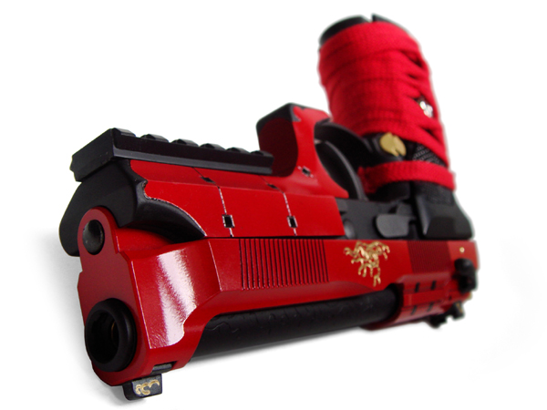 スライドや本体と色を合わせた「赤い柄糸巻き」の拵え。