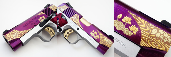 高品質のステンレス鋼を最新の電解技術で染めたスライド。銘が表すとおり美しい紅紫色で、部分的に紫が濃くなるなど意図的なムラ染めになっている。側面には京の職人による金蒔絵が施されおり、琳派の"河と蓮"の図柄が蒔かれている。
