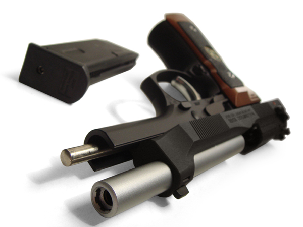 素材はスタンダードモデルと同じステンレスバレルだが、携帯性を最優先とするため「ショートバレル」に交換されている。これによりホルスターからの素早いドロウも容易になっている。 ○マルイタクティカルマスターのショートバレルに交換。キャロムシルバーで塗装後にジルコニアコーティングしました。