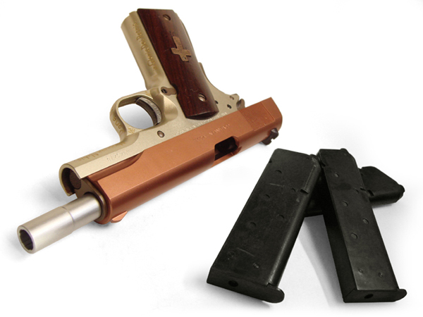 口径や内部構造には一切手は加えられなかったが、スライドには魔除けの効果を持った銅のコーティングが施され、フレーム、特にトリガー周りにはラテン語の聖句が彫り込まれた。トリガーは純銀製の特注品に交換され、グリップには素朴ながら金属製の十字架が埋め込まれた。使用弾薬は.45口径だが、弾頭は純銀製の専用弾を使用する。