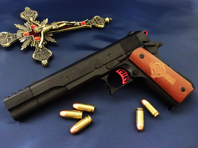 トリガーガードは独特の形に加工され正面には聖なる十字の飾りが取り付けられており、悪魔によるトリガーへの干渉を防いでいる。