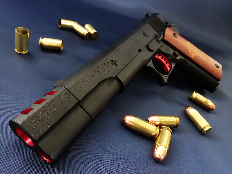 スライド側面にはエングレーヴのような模様が「浮き出し」ており、一見して普通の銃ではない不気味な雰囲気が漂う。