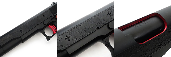 エングレーヴ風の模様と文字刻印の左右に十字架が浮き出した黒いスライド。チャンバー周辺の内側だけが赤く見える。