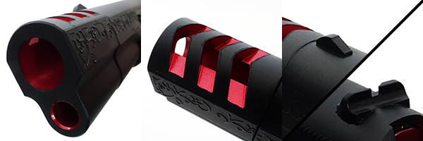 スライド固定式のコンペンセイター。銃口内部、リコイルガイド穴内部、ガスホールの内側など、パーツの内部のみが真紅に染まっている。これは長年取り込み続けた悪魔の魂の影響とされている。