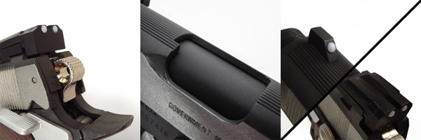 前部にはコッキング用のセレーションが追加され、これにより緊急時の装弾、排莢をより確実に行うことが出来る。側面は磨き上げた半鏡面仕上げ。
