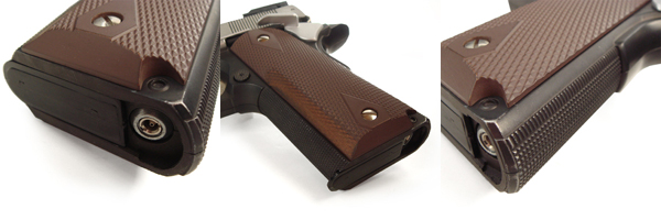 より握りこむためのフラットタイプ。更に射撃時の反動で滑らないようステッピングが施してある。 ○ベースそのままです。