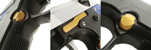 また各パネルは複数の金属ボルトで止めてあるのでしっかりとフレームに固定され、なおかつメカニカルな印象。なお右面グリップパネル上部のネジはトリガーに伸ばす指があたる部分のため、キャンセルしてある。