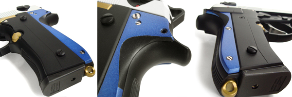 未来的な印象のフラットなグリップパネルで、左右両面それぞれに前後の2ピース構造。極限まで薄くスリムに、また指のあたる部分を削いでいるのでフィッティングも抜群。しっかりと握りこんで銃をホールドできる。
