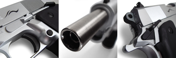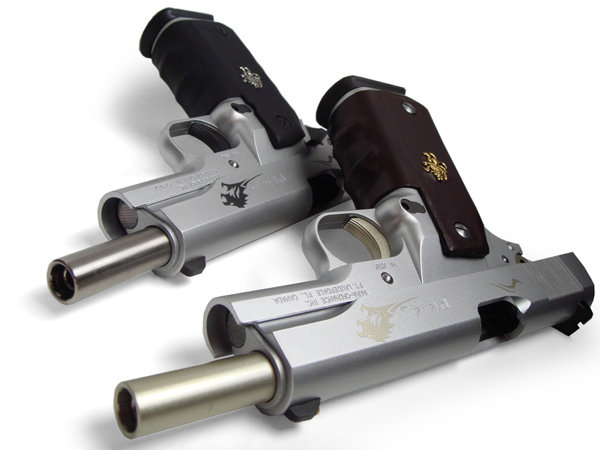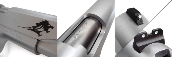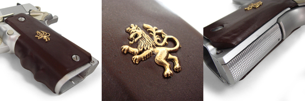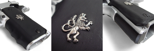 2丁ともノーマルのステンレス-スライドのままだが、その側面の刻印表示の両端にはそれぞれ金と黒で吼える獅子のシルエットが描かれている。象徴的な意味があるとはいえ、このカスタム銃ではグリップ飾りと合わせて唯一純粋に装飾的な部分である。 ○スライド本体は元々きれいなステンレス色だったので、模様の部分だけステンシルの要領で塗装しました。この獅子のデザインはFF8のライオンハートやトライバル模様のライオンなんかを参考にして自作してます。既製品のシールなんかに比べて手間は格段に掛かりましたが、その甲斐あって大げさなカスタムをしてない本作においてかなり良いワンポイントになりました。