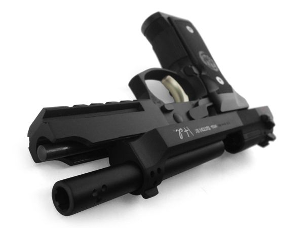 カラーリングもほぼ一色、最も基本的な艶消し黒。これまでもさんざんカスタムしてきたM9にさらに機能性とパワーを持たせようと各部を現代風にアレンジして、設定も9mm以上の威力を持つ「新型弾薬仕様」として形を整えました。