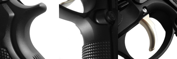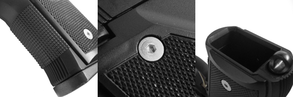 マグキャッチボタン周りと右面のトリガーにかけてのライン上をシェイプし、操作性を高めている。また、グリップスクリューはステンレス製のヘキサゴンタイプ。