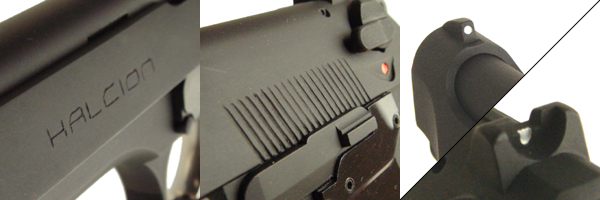 ベースであるM9(ベレッタM92FS)のスライドを極限まで削り込んだ形状。オリジナルのパーツを削り込んだのか、強度の高い別素材で新造したのかは不明。右側面には「HALCION」の銘が刻まれている。 ○ベースのスライドを時間をかけて切削&研磨して加工しました。セレーションと刻印も新たに彫っています。全体にマットブラック塗装仕上げ。