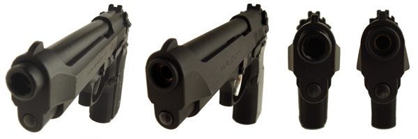ショートタイプバレル。オリジナルのM9に比べて短く、取り回しがしやすく、近接戦闘に特化している。バレル選定にあたってはもちろん特に精度の良いものを厳選している。 ○キャロムの真鍮製ショートタイプバレルに交換しています。これでフロントへの重みが増して、ちょうど良い重量バランスになりました。