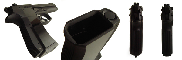 この銃の最大の特徴。グリップパネルを完全に廃し、ベースフレームとほぼ同じ厚みに抑えることで、M9(複列弾倉)特有のグリップの太さを克服し、製作者の意図する「手先と一体になる」握り心地を体現している。この製作にはフレームへの鉄板溶接と研磨が繰り返し行われた。なおグリップ底部のランヤードリングも廃されている。