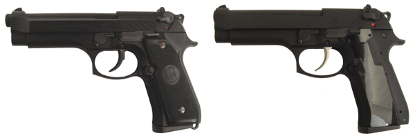 全体比較写真。左がM9、右がHALCION。(※M9は、手元にベレッタ純正タイプのがなかったためスライドストップだけオリジナルと違う“ロングタイプ”になっています。本来はもっと短いです)