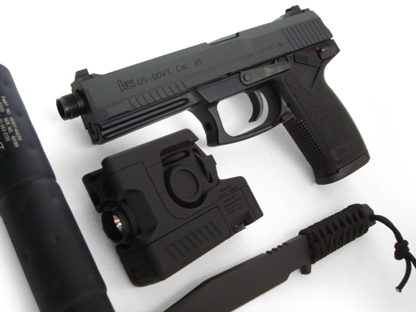 実銃はアメリカ軍がSOCOM(合衆国特殊戦統合軍)向けとして1991年、ヘッケラー&コッホ社に開発依頼した自動拳銃。命中精度テストや発射耐久テスト、海水に浸す腐食性のテスト等のトライアルの結果、コルト社を破って制式採用されました。大型サイズで、グローブ装着を前提としたトリガー周りのパーツ設計、専用オプション用レールやサプレッサー用のバレルスクリューの標準装備など、とにかく“特殊作戦用”に特化したプロ仕様の拳銃です。