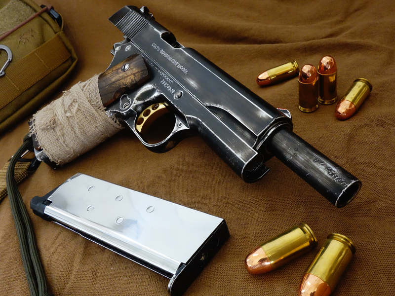 マルイのコルトガバメント シリーズ'70 ニッケルフィニッシュをベースに「世界を股にかけて伝説と財宝を追う冒険家の愛用するハンドガン」をイメージして製作したワークショップカスタム。