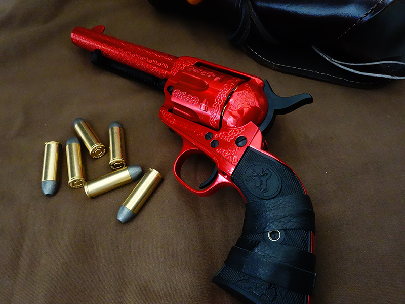 実銃はコルト・シングルアクション・アーミー、西部開拓時代に使用されていた回転式拳銃。同時代に大量普及した決定版ともいうべき拳銃で、その威力と抑止力で開拓時代の秩序と平和を築いたことから通称“ピースメーカー”とも呼ばれています。