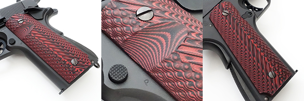 G10素材のグリップパネルに交換されている。"G10"は、ナイフのハンドルとしても多用される樹脂素材で、グラスファイバー製基材にエポキシ樹脂をしみこませ、高温高圧化で硬化させた積層構造の素材。滑り止め効果が高く、濡れた手で握っていても確実に銃を保持できる。G10素材は樹脂のため様々なカラーリングが存在するが、敢えて木製グリップに近い色合いのものを使用している。
