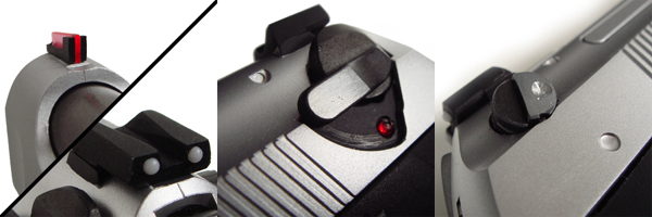 フロントは集光樹脂を利用した集光サイト、リアはノバック型のドットタイプが標準装備されている。どちらも実戦的で確実に標的を捕捉できる。 ○前後ともベースのサイトを削り落として、プラ製オリジナルのサイトを取り付けました。フロントには実際に集光アクリル材を使用しているので、薄暗い所でもちょっと光って見えます。