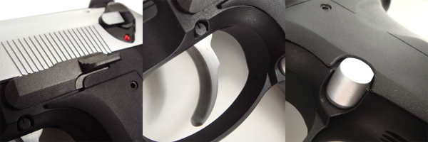 最新素材のメタリマル樹脂製。素材配合によって成形色も変えられるためスライドはシルバーになっている。耐久強度は従来のスチール材の1.5倍で、逆に重量は2/3に抑えられている。 ○ベレッタ90twoのスライドを意識してベースのM9スライドを削って成形しました。研磨後にキャロムシルバーで塗装仕上げ。