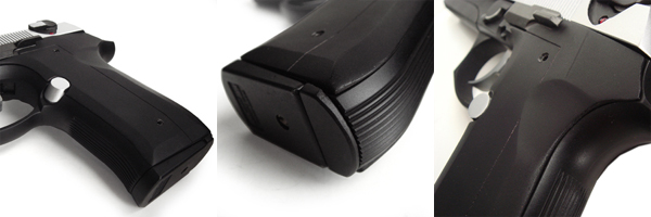 素材はメタリマル樹脂製。フロントは標準のスムースタイプの他、のちにレイル装備タイプも登場した。また、テイクダウンレバーは誤作動防止のフラットタイプ、トリガーは高強度ステンレス製が採用されている。 ○ベースのM9フレームにプラ材オリジナル加工の延長パーツを継ぎ足しました。すこしゴツイ雰囲気ですが、意外にホルスターへの収まりは良くなっています。