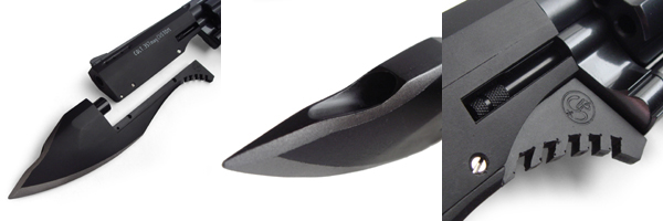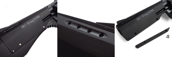 ブレード装着と強化の為にスクエア型にカスタマイズされている。ボルト固定式で専用ブレードも装着可能。左側面には「COLT .357mag CUSTOM」の刻印。上部には8ホールのガスポートがあり、発射時のガスによる反動を軽減する。 ○パーツをオリジナル製作。研磨後、インディ・ブラックパーカーで塗装。底面のレールは実際にネジ4個の固定でブレード着脱ができ、ブレード未装着の場合はレールを埋めるスペーサーも取り付けられます。刻印は手彫りで白でスミ入れ済み。ガスポート部分は艶ありブラックで、本体との質感の違いを出しています。