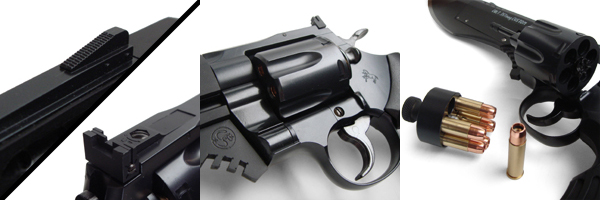ベースのマグナムリボルバーのサイトをそのまま使用。フロントは固定式だが、リアは調節ネジで上下左右に調整可能。調整と射撃の腕があれば精度の高い精密射撃も可能となっている。 ○ベースそのままです。リアは実際にフル・アジャスタブル式なので調節できます。