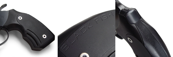ブレードでの格闘攻撃も考慮してデザインされたカスタムグリップ。これは黒い男が町を救った数年後、調整の為に再訪した彼へガンスミスが贈ったものといわれている。全体にはリボルバーらしいグリップ形状だが、2層パネル式やスリットなど、独特なデザイン要素もある。ラバー&ポリマーの二つの素材でできており、カラーリングも質感の違う2トーン=ブラック。両側面には「BLACK FISH」の銘が彫りこまれている。