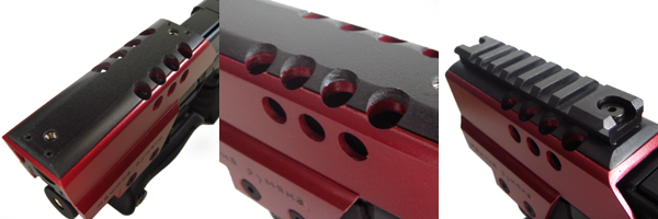 本体スライドやフロントサイトからはしっかりと1mm以上の隙間を設けてあるので、ブローバックの動作に干渉する心配はありません。アンダーユニットに六角ボルト4本で固定、取り外しも可能。メタリックレッド塗装仕上げ。