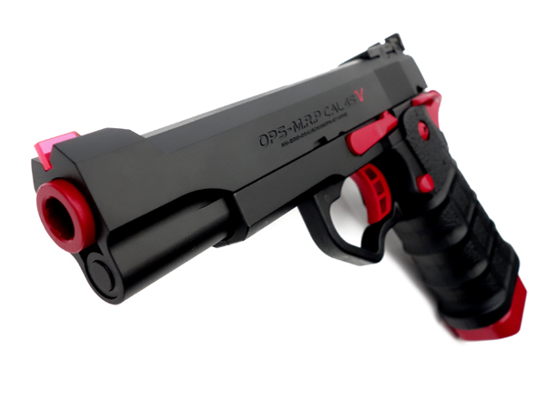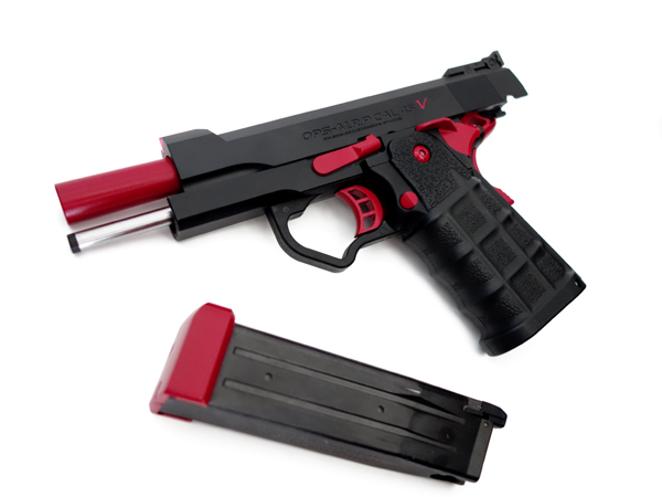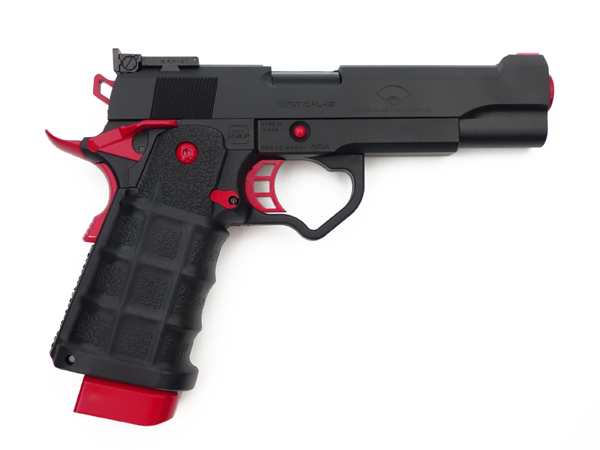 実銃モチーフはおそらくSTI(Science Technolgy Ingenuity)社製のガバメントモデル。世界スピード射撃選手権者のチップ・マコーミックと共同開発したコンバットシューティング・ガンで、スティール製レシーバーとポリマー製グリップを一体化させ、軽量化と高強度性を合わせ持つ多弾倉フレームを搭載した「現代的戦闘銃」です。