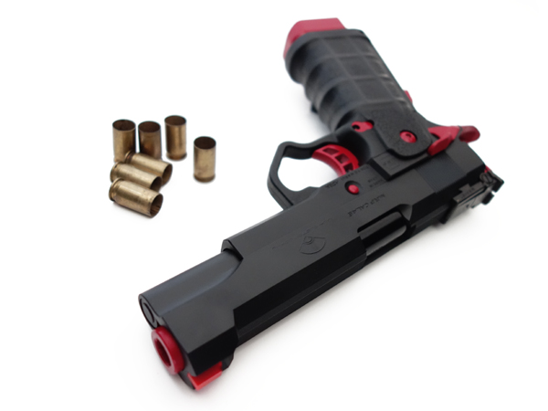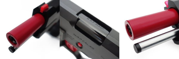 分厚い.45口径のコーン型バレル。チャンバーカバーは艶のある黒で、バレル自体は赤く着色されている。各種の特殊弾薬を正確に発射できるよう強化されている。スプリングガイドロッドはシルバーで、先端だけ艶消しの黒色。