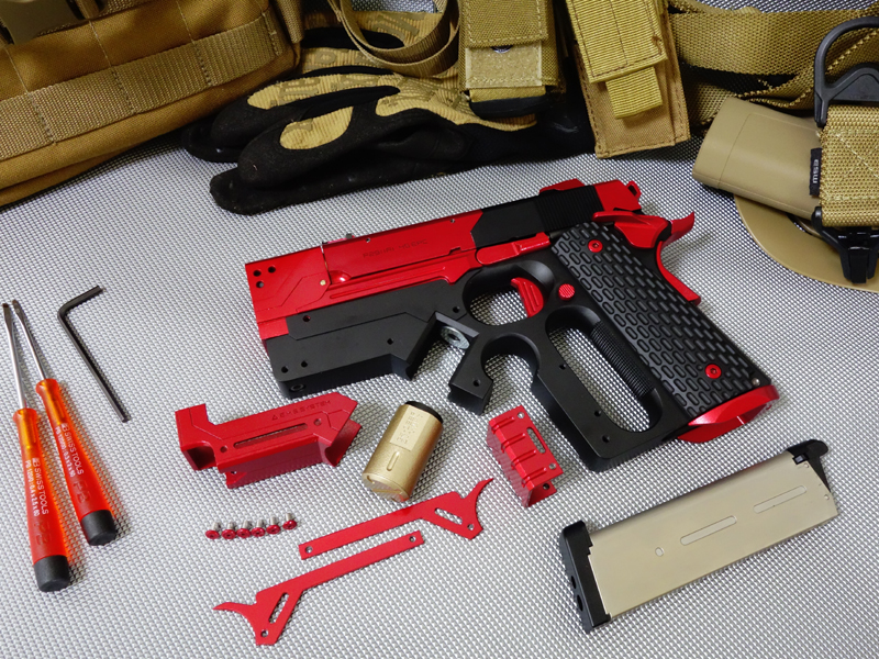 このデトニクスのスライドとガバメント系のフレームを組み合わせ、さらに近接戦闘に特化したカスタムモデルを、性能・品質共に信頼性抜群の東京マルイがモデルアップ。マズル面をスパイク状に加工した「ストライクプレート・コンペンセイター」やレールマウント、マグウェルなど、随所に現代的なCQBカスタムアレンジを加えており、コンパクトスライドのショートリコイルと相まってトイガンとしても非常に実用性の高い内容のモデルだと思います^^