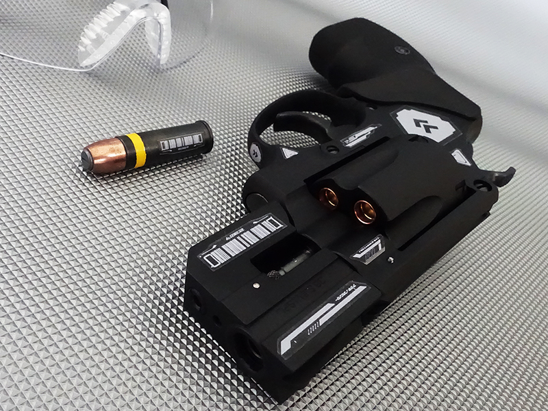 特殊軽量合金を使用したフレームとシリンダー。バレルと同じく特殊印刷によって各部の状態が表面に表示されている。シリンダーには5発のうち残り1発が一目で確認できる「ラストバレットインジケーター」が設けられているが、これはスマートグラスにも残弾数が表示されているため、あくまで故障や妨害を受けた際の緊急補助用のようだ。
