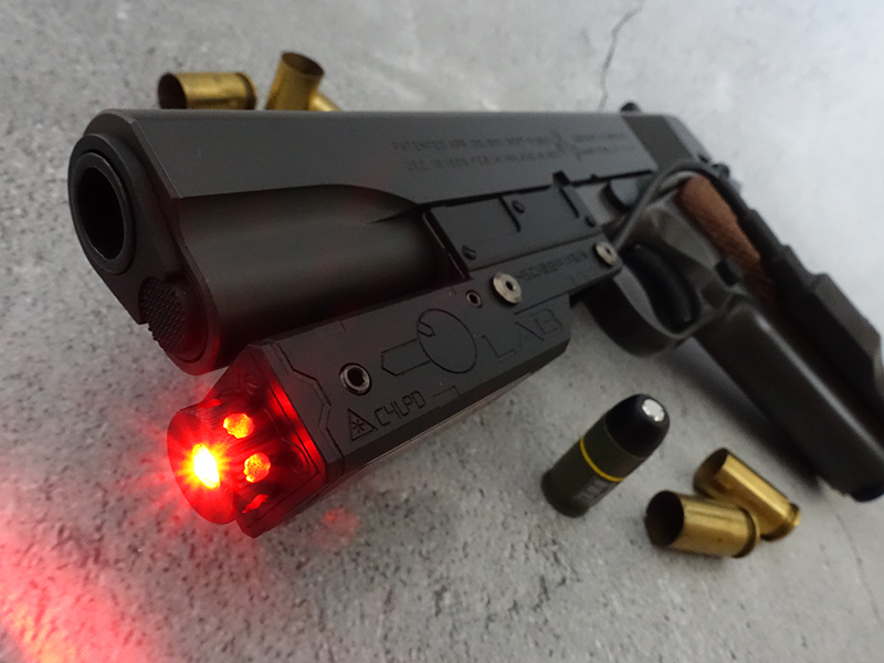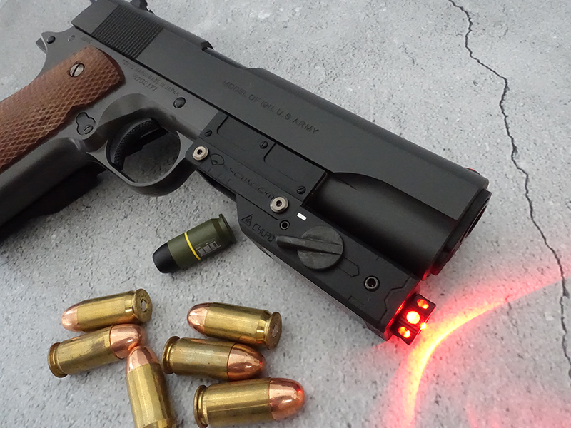 一般サイズのM1911A1に装着する「レーザーで目標距離を計測して発射した専用弾を着弾寸前で炸裂させる補助装置」をイメージして製作したオリジナルカスタム。