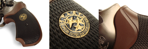同じマルシンのM36用のJフレーム用ラバータイプグリップに交換、レザー風のブラウンで塗り分けてメダリオンを埋め込んでいます。